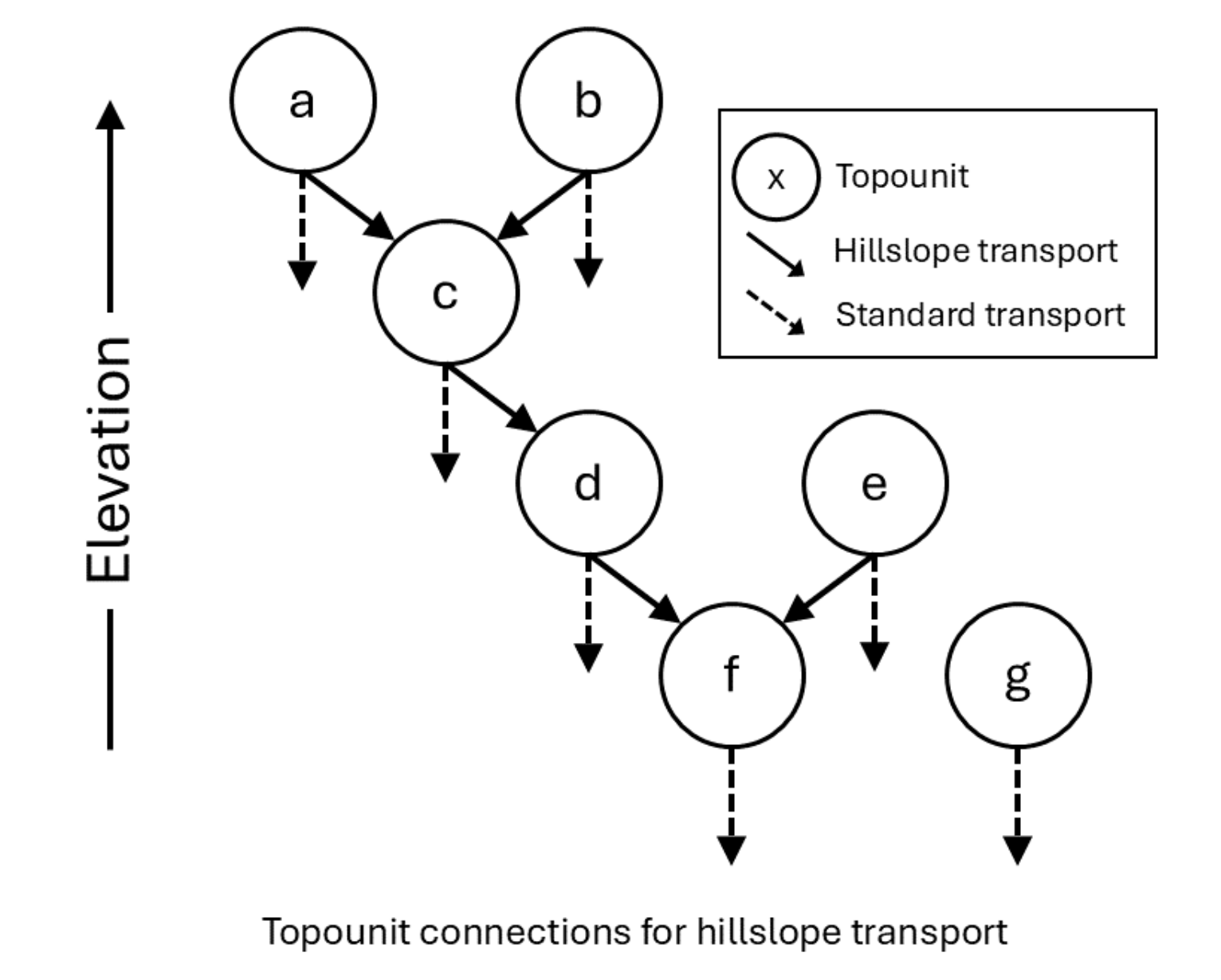 Connections among multiple topounits (labeled a through g) on a single gridcell. Each topounit is connected to at most one other downhill topounit (the next lowest in elevation), while the lowest topounit does not have a downhill connection.¶ |
