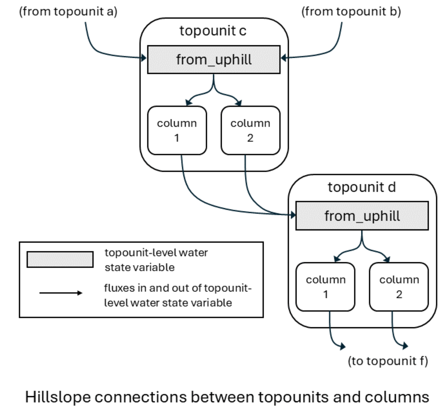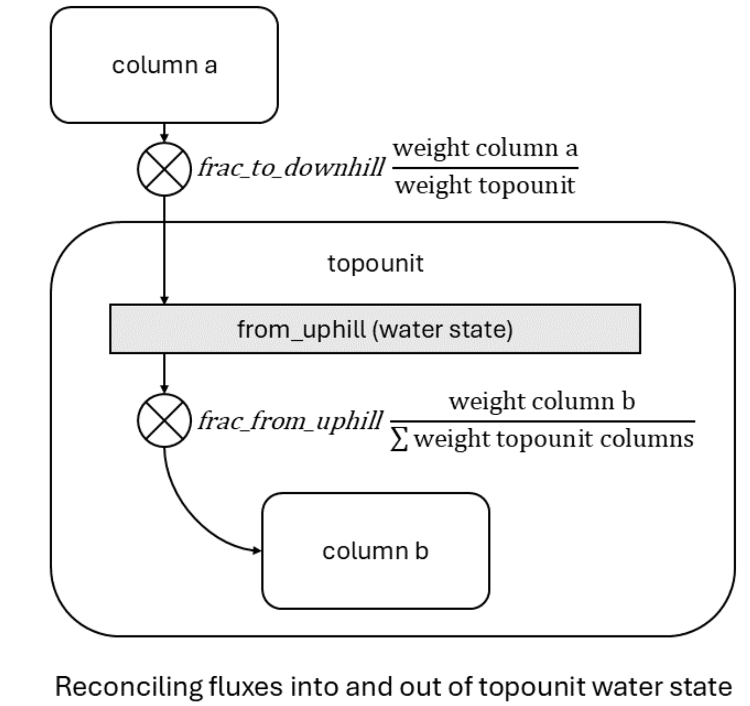 Summary representation of hillslope hydrology fluxes at the topounit level. The water state variable for one topounit (gray shaded box) receives water from a column on an uphill topounit (column a). The operator symbol represents combined user parameter for the fraction of column-level flux to transport downhill and the scaling factor accounting for potential difference in area between the upstream column and the downstream topounit. Water leaving the topounit water state is moved to columns on the topounit .¶ |